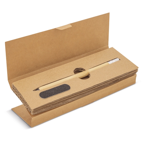 Set de cart?n reciclado compuesto por un l?piz infinito, fabricado en bamb? con goma que no deja residuos y lima, para afilar la punta y tenera siempre como nueva.